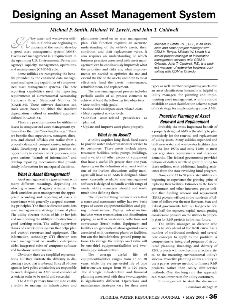 a good asset management system (AMS). condition, and their replacement value. It CDM in Tampa. Michael W. Lovett is a