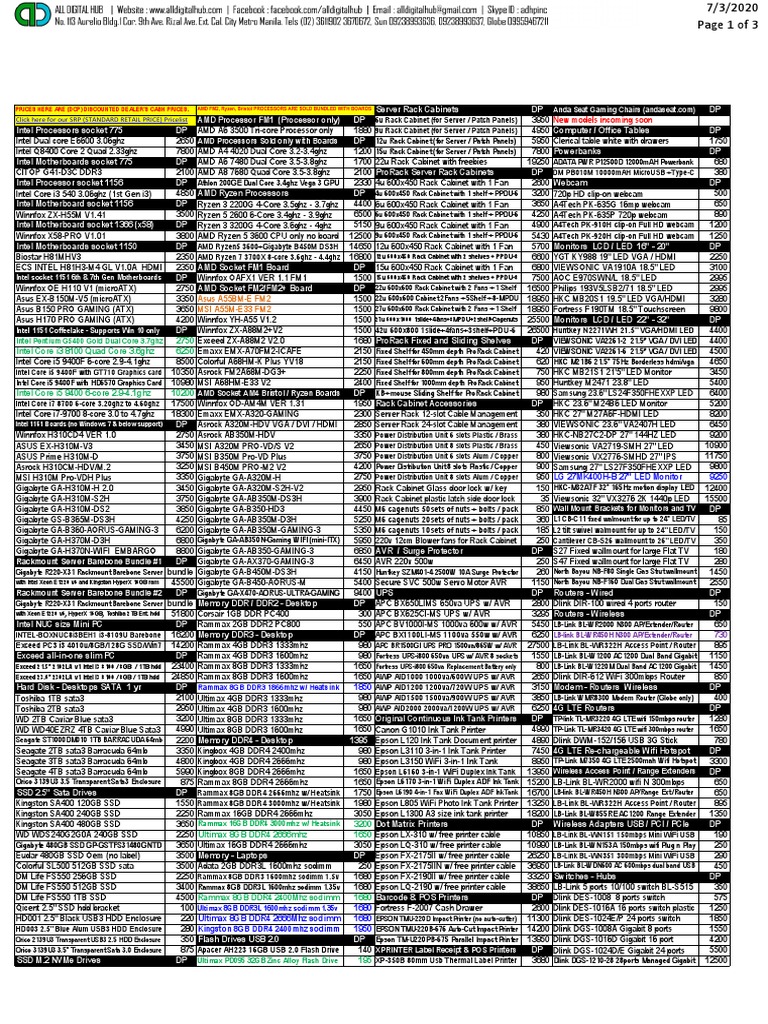 Click here for our SRP (STANDARD RETAIL PRICE) Pricelist AMD Processor FM1 (Processor only) DP 6u Rack Cabinet (for Server / Patch Panels) 3950 New models incoming soon