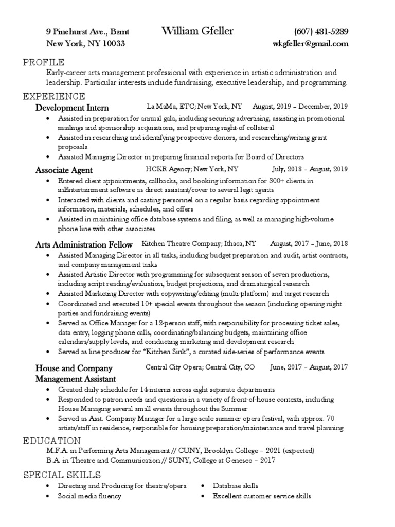 Arts Administration Fellow Kitchen Theatre Company; Ithaca, NY August, 2017 – June, 2018