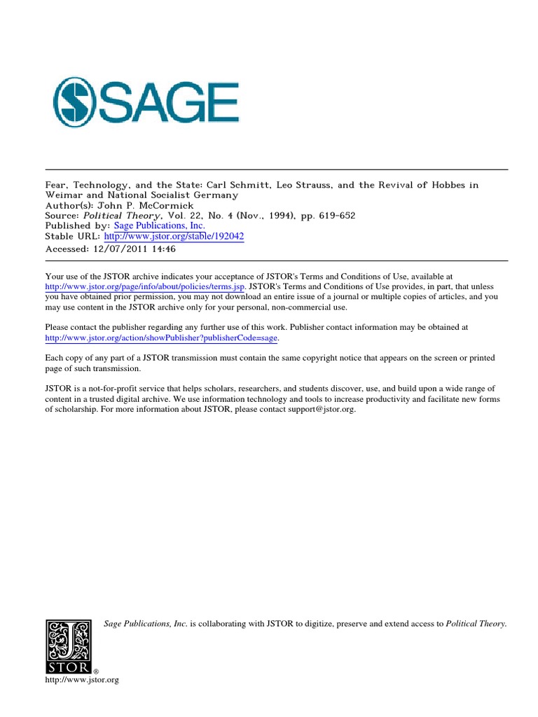 Fear, Technology, and the State: Carl Schmitt, Leo Strauss, and the Revival of Hobbes in