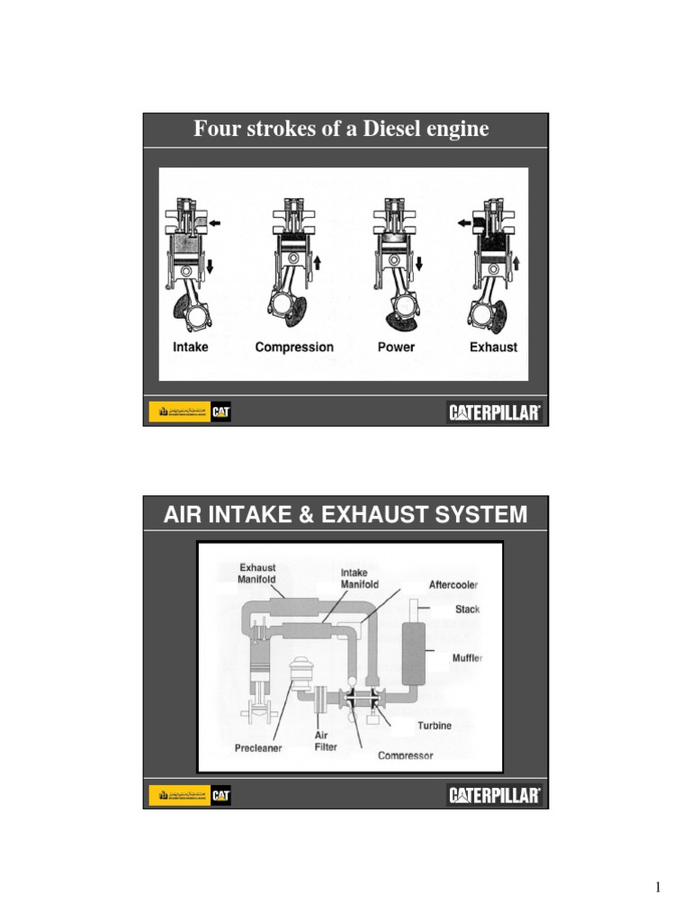 The document discusses the four main systems of a Diesel engine: 1) the air intake and exhaust system which brings in air and expels exhaust gases, 2) the cooling system which regulates the engine's temperature, 3) the lubrication system which reduces friction between moving parts, and 4) the fuel system which supplies and injects fuel into the combustion chamber.