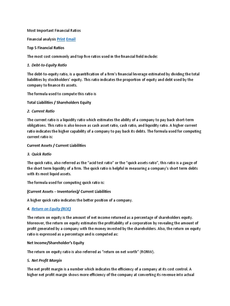 The most cost commonly and top five ratios used in the financial field include: