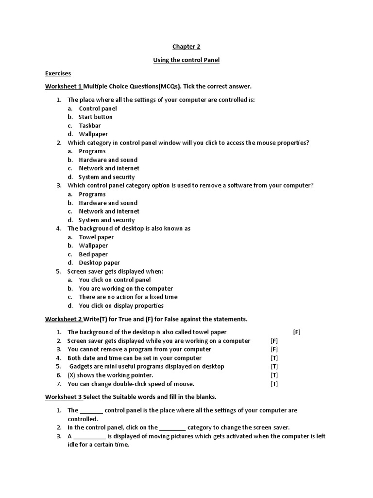 Worksheet 2 Write(T) for True and (F) for False against the statements.