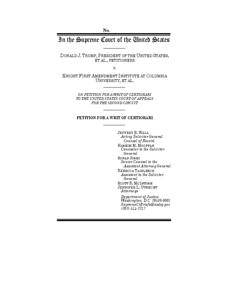 Twitter, Inc. is a social media company that enables its users to create accounts through which they post “tweets” and interact with each other. Twitter permits users to “block” other individual users’ accounts, and a blocked user account cannot directly see or reply to the blocking user’s tweets. President Donald J. Trump cre-ated a Twitter account as a private citizen in 2009. He has continued to use that personal account since assum-ing the Presidency, including to announce official ac-tions or policies. In 2017, President Trump blocked in-dividual respondents’ Twitter accounts from his per-sonal account after respondents posted messages on their accounts criticizing him or his policies. The court of appeals held that, in doing so, President Trump vio-lated the First Amendment. The question presented is: Whether the First Amendment deprives a govern-ment official of his right to control his personal Twitter account by blocking third-party accounts if he uses that personal account in part to announce official actions and policies.
