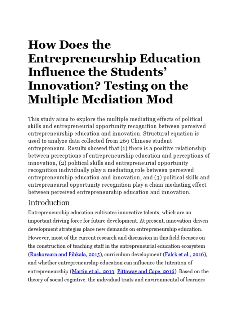 1989). Entrepreneurship education is an important way for entrepreneurs to