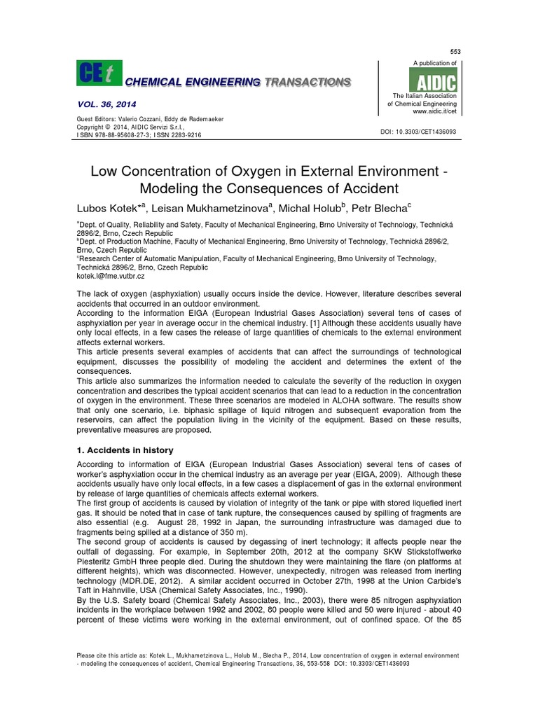 - modeling the consequences of accident, Chemical Engineering Transactions, 36, 553-558 DOI: 10.3303/CET1436093