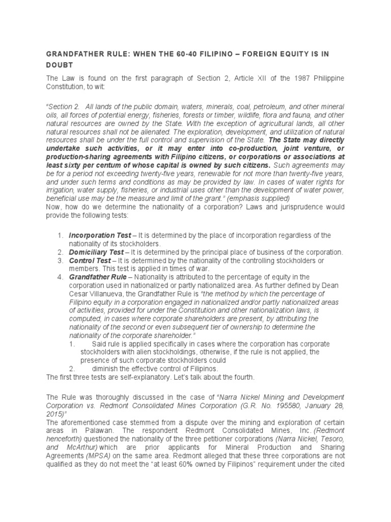 GRANDFATHER RULE: WHEN THE 60-40 FILIPINO – FOREIGN EQUITY IS IN