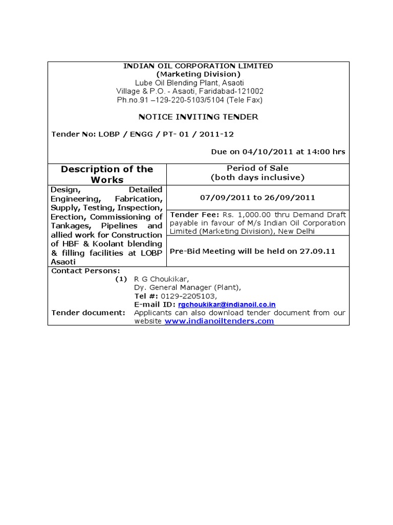Tender No: LOBP / ENGG / PT- 01 / 2011-12
