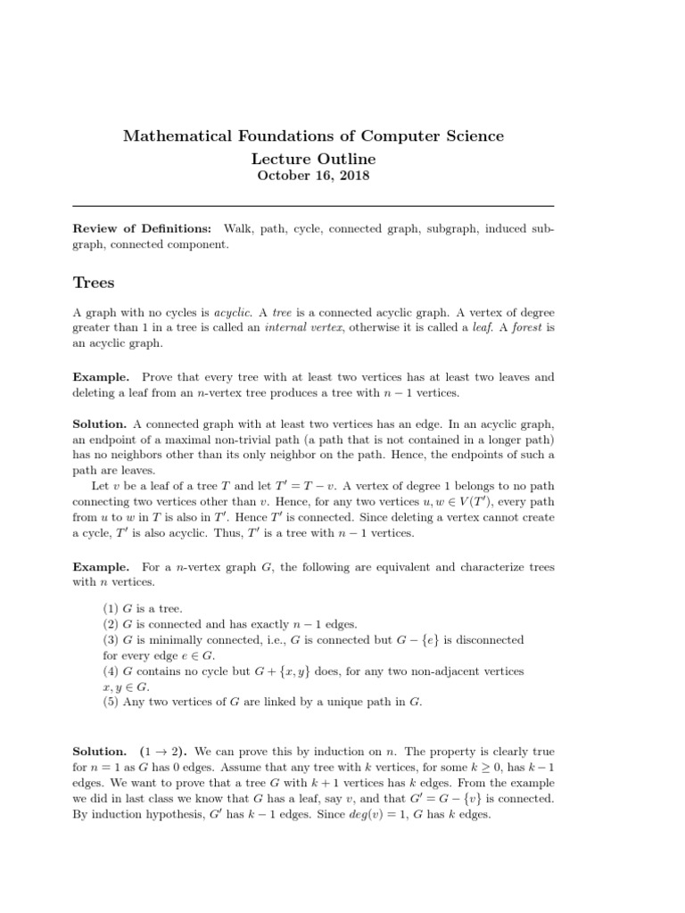 a cycle, T 0 is also acyclic. Thus, T 0 is a tree with n − 1 vertices.