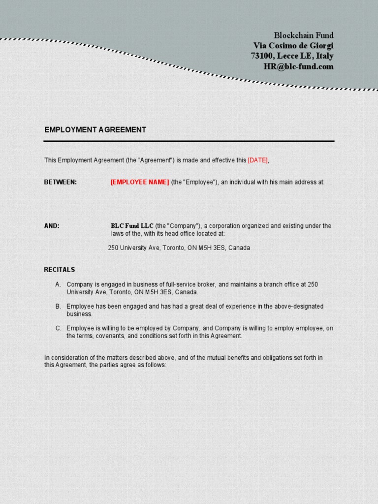 BETWEEN: [EMPLOYEE NAME] (the "Employee"), an individual with his main address at: