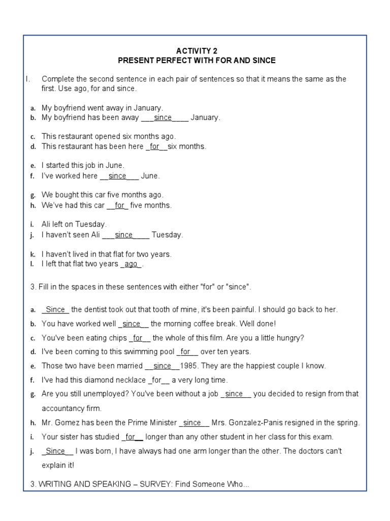 3. Fill in the spaces in these sentences with either "for" or "since".