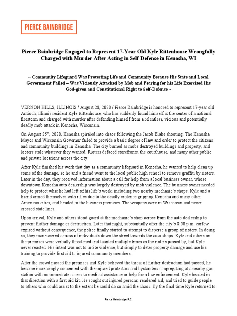 VERNON HILLS, ILLINOIS / August 28, 2020 / Pierce Bainbridge is honored to represent 17-year old Antioch, Illinois resident Kyle Rittenhouse, who has suddenly found himself at the center of a national firestorm and charged with murder after defending himself from a relentless, vicious and potentially deadly mob attack in Kenosha, Wisconsin. On August 25