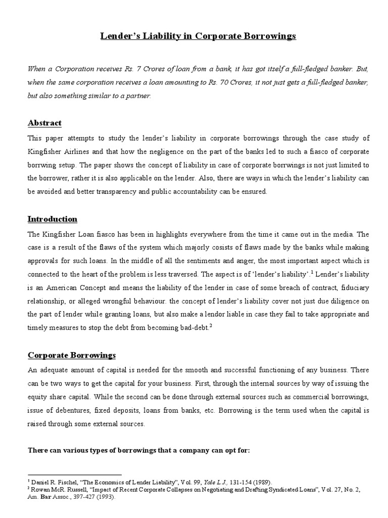 This paper attempts to study the lender’s liability in corporate borrowings through the case study of