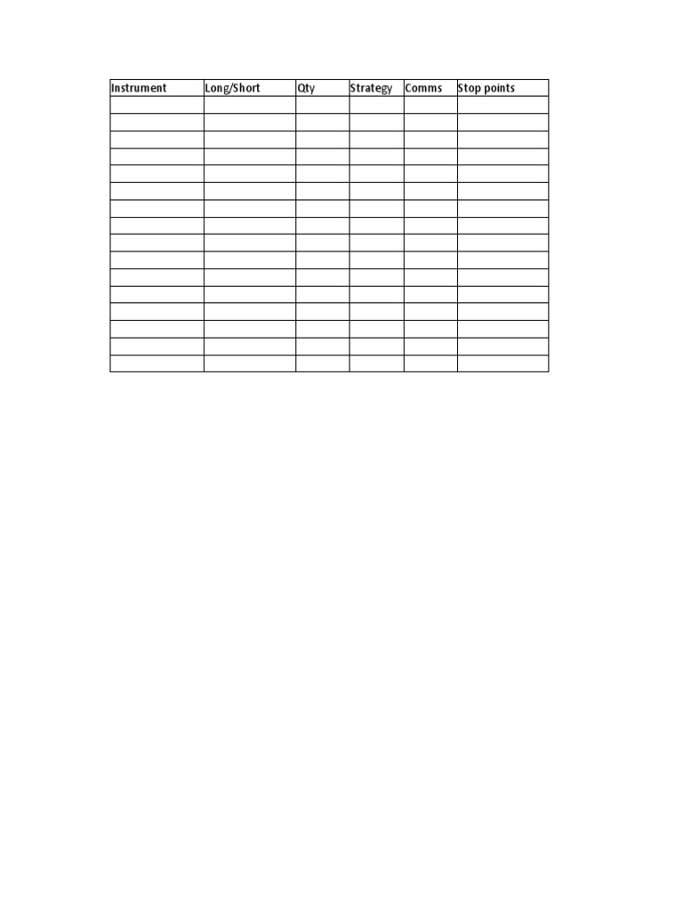 This document appears to be a trading record that lists various instruments traded, whether they were long or short positions, quantities, strategies used, commissions paid, stop points set, profits or losses, and reasons for the trade outcomes. It seems to be tracking details of past trades such as what was traded, how much, the approach taken, associated costs, risk management parameters, financial results, and analysis of why trades were successful or not.
