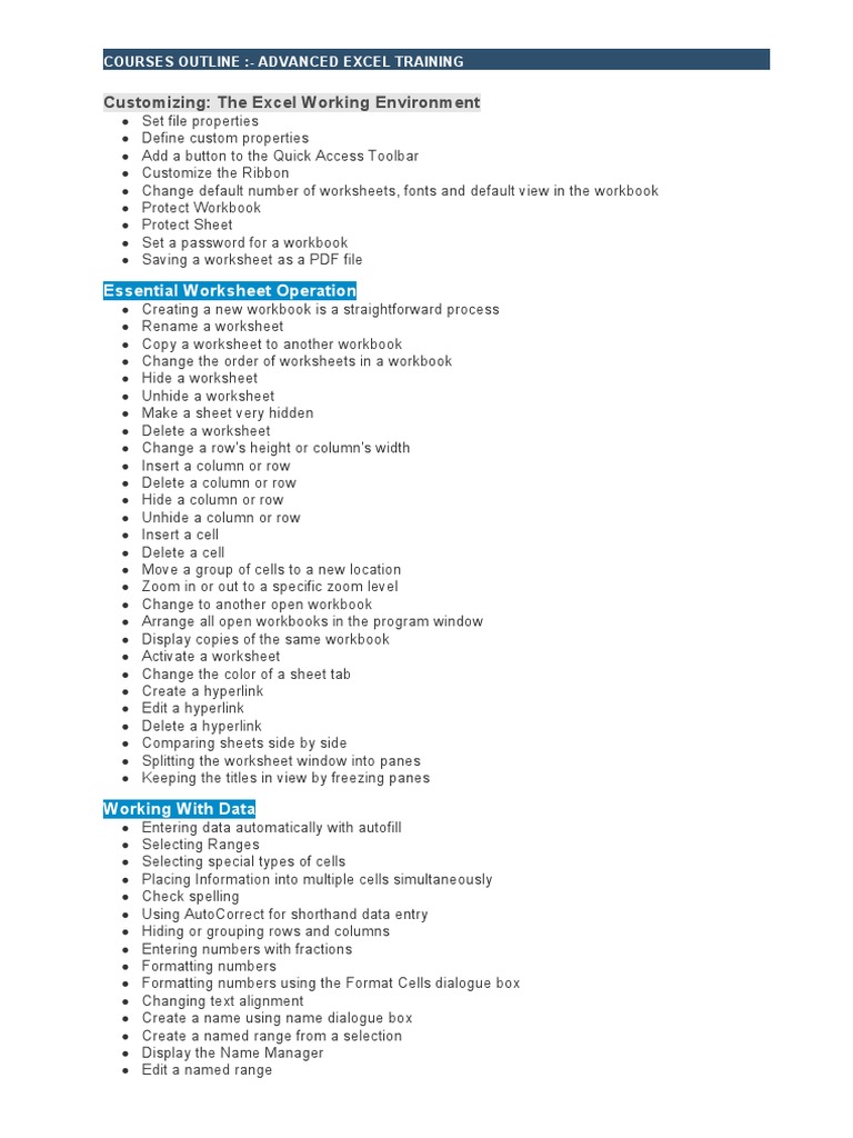 COURSES OUTLINE :- ADVANCED EXCEL TRAINING
