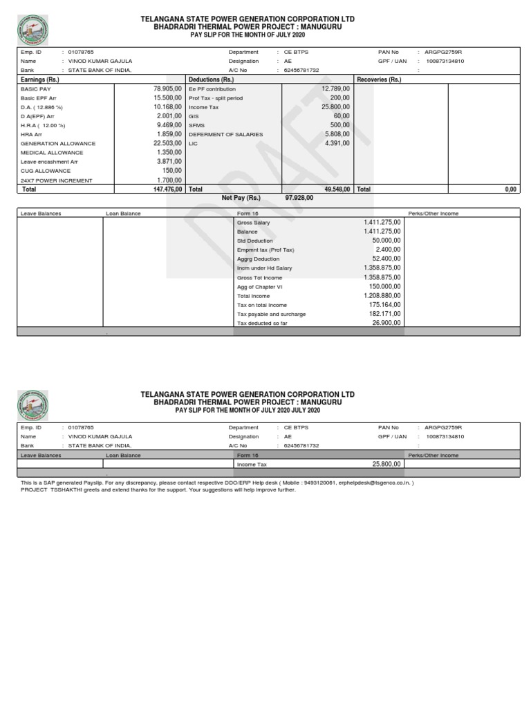 This is a SAP generated Payslip. For any discrepancy, please contact respective DDO/ERP Help desk ( Mobile : 9493120061, erphelpdesk@tsgenco.co.in. )