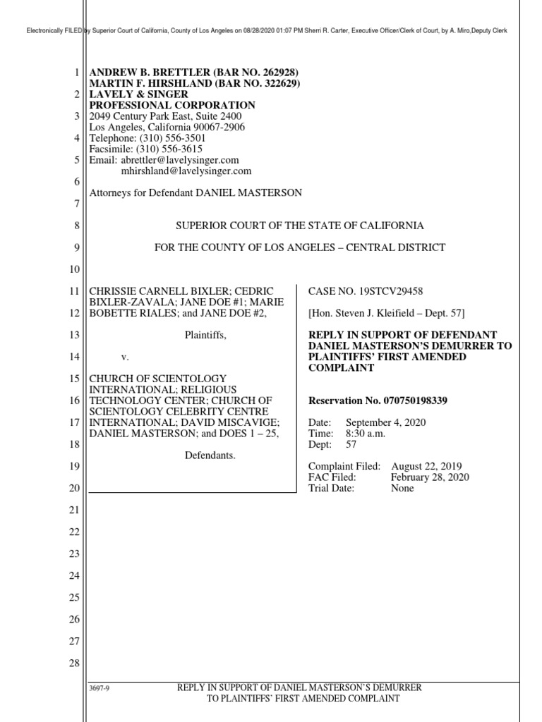 2049 Century Park East, Suite 2400 Los Angeles, California 90067-2906 Telephone: (310) 556-3501 Facsimile: (310) 556-3615 Email: abrettler@lavelysinger.com mhirshland@lavelysinger.com Attorneys for Defendant DANIEL MASTERSON SUPERIOR COURT OF THE STATE OF CALIFORNIA FOR THE COUNTY OF LOS ANGELES – CENTRAL DISTRICT CHRISSIE CARNELL BIXLER; CEDRIC BIXLER-ZAVALA; JANE DOE #1; MARIE BOBETTE RIALES; and JANE DOE #2, Plaintiffs, v. CHURCH OF SCIENTOLOGY INTERNATIONAL; RELIGIOUS TECHNOLOGY CENTER; CHURCH OF SCIENTOLOGY CELEBRITY CENTRE INTERNATIONAL; DAVID MISCAVIGE; DANIEL MASTERSON; and DOES 1 – 25, Defendants. CASE NO. 19STCV29458 [Hon. Steven J. Kleifield – Dept. 57]
