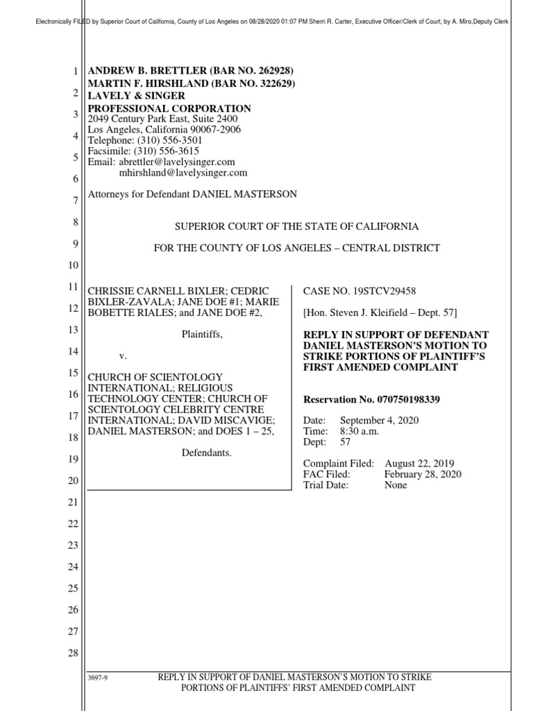 2049 Century Park East, Suite 2400 Los Angeles, California 90067-2906 Telephone: (310) 556-3501 Facsimile: (310) 556-3615 Email: abrettler@lavelysinger.com mhirshland@lavelysinger.com Attorneys for Defendant DANIEL MASTERSON SUPERIOR COURT OF THE STATE OF CALIFORNIA FOR THE COUNTY OF LOS ANGELES – CENTRAL DISTRICT CHRISSIE CARNELL BIXLER; CEDRIC BIXLER-ZAVALA; JANE DOE #1; MARIE BOBETTE RIALES; and JANE DOE #2, Plaintiffs, v. CHURCH OF SCIENTOLOGY INTERNATIONAL; RELIGIOUS TECHNOLOGY CENTER; CHURCH OF SCIENTOLOGY CELEBRITY CENTRE INTERNATIONAL; DAVID MISCAVIGE; DANIEL MASTERSON; and DOES 1 – 25, Defendants. CASE NO. 19STCV29458 [Hon. Steven J. Kleifield – Dept. 57]