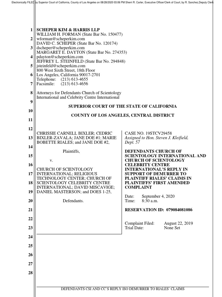 CHRISSIE CARNELL BIXLER; CEDRIC BIXLER-ZAVALA; JANE DOE #1; MARIE BOBETTE RIALES; and JANE DOE #2, Plaintiffs, v. CHURCH OF SCIENTOLOGY INTERNATIONAL; RELIGIOUS TECHNOLOGY CENTER; CHURCH OF SCIENTOLOGY CELEBRITY CENTRE INTERNATIONAL; DAVID MISCAVIGE; DANIEL MASTERSON; and DOES 1-25, Defendants. CASE NO. 19STCV29458