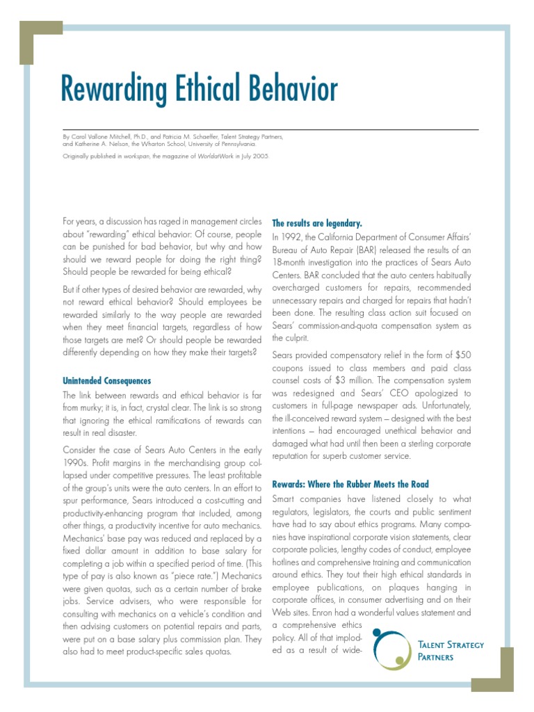 The link between rewards and ethical behavior is far was redesigned and Sears’ CEO apologized to