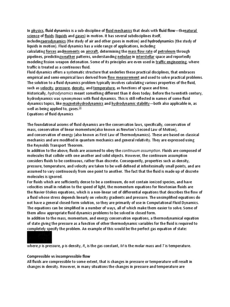 liquids in motion). Fluid dynamics has a wide range of applications, including