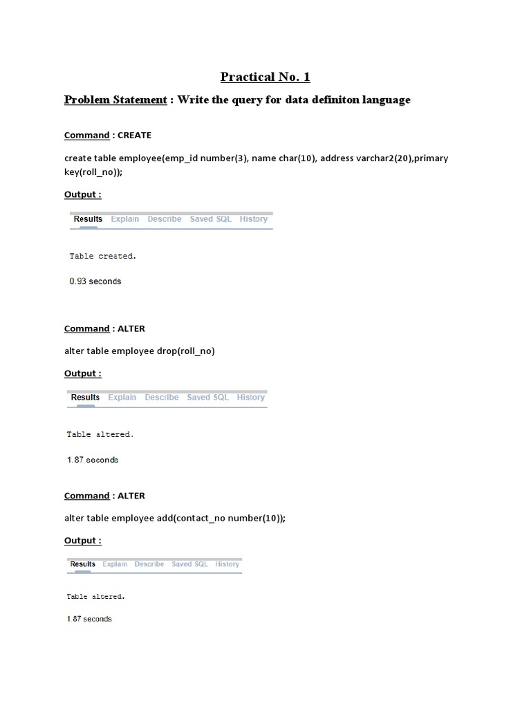 create table employee(emp_id number(3), name char(10), address varchar2(20),primary
