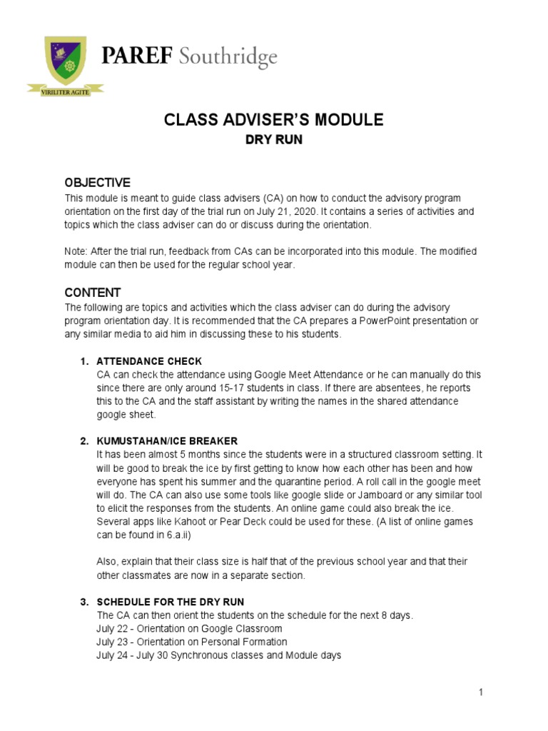 This module is meant to guide class advisers (CA) on how to conduct the advisory program