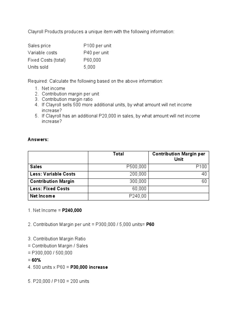 5. If Clayroll has an additional P20,000 in sales, by what amount will net income
