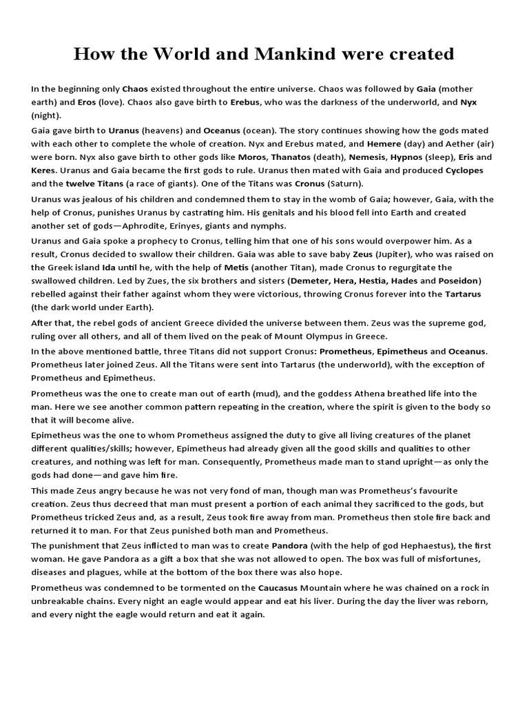 Gaia gave birth to Uranus (heavens) and Oceanus (ocean). The story continues showing how the gods mated