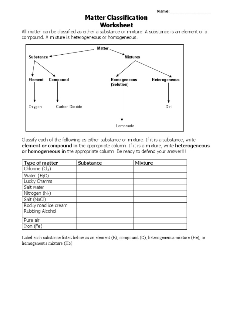 element or compound in the appropriate column. If it is a mixture, write heterogeneous