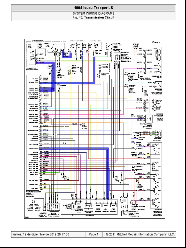 The document provides a wiring diagram for the transmission circuit of a 1994 Isuzu Trooper LS. It includes a diagram with labeled components and wires for the transmission.