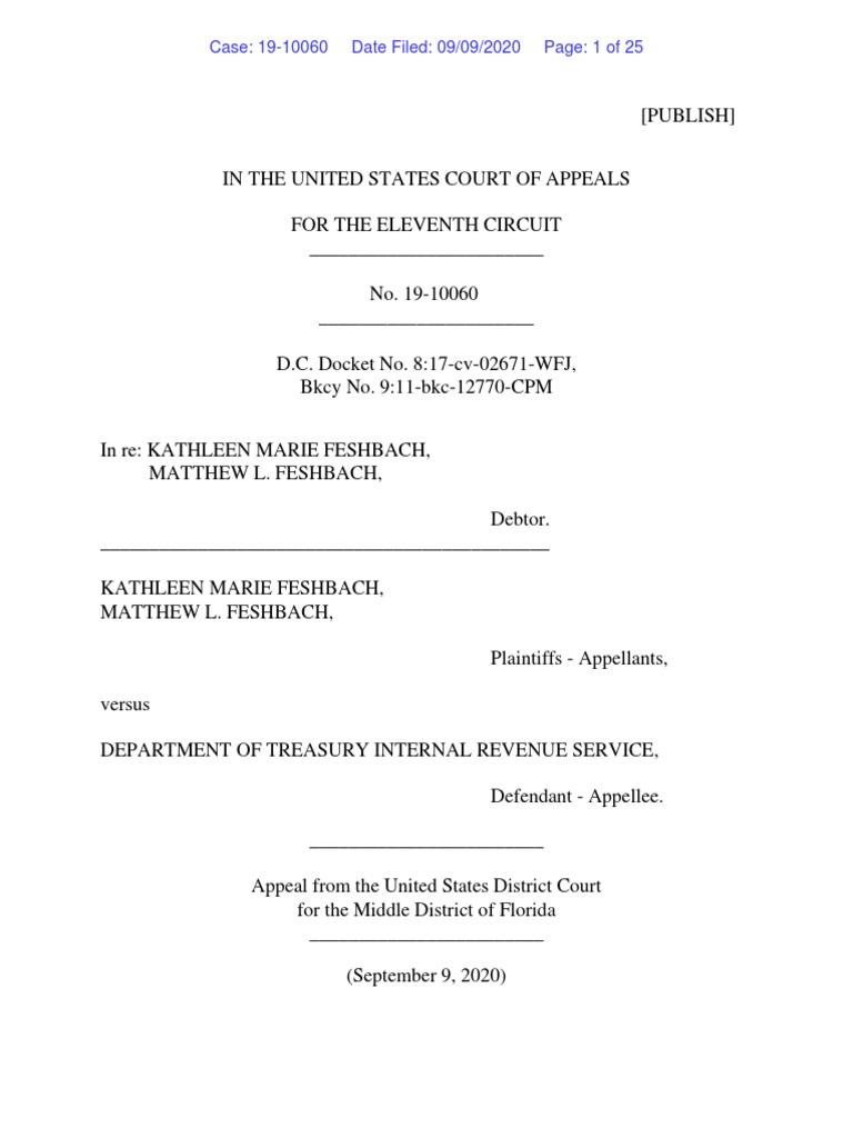 [PUBLISH] IN THE UNITED STATES COURT OF APPEALS FOR THE ELEVENTH CIRCUIT ________________________ No. 19-10060 ______________________ D.C. Docket No. 8:17-cv-02671-WFJ, Bkcy No. 9:11-bkc-12770-CPM In re: KATHLEEN MARIE FESHBACH, MATTHEW L. FESHBACH, Debtor. ______________________________________________ KATHLEEN MARIE FESHBACH, MATTHEW L. FESHBACH, Plaintiffs - Appellants, versus DEPARTMENT OF TREASURY INTERNAL REVENUE SERVICE, Defendant - Appellee. ________________________ Appeal from the United States District Court for the Middle District of Florida ________________________ (September 9, 2020)