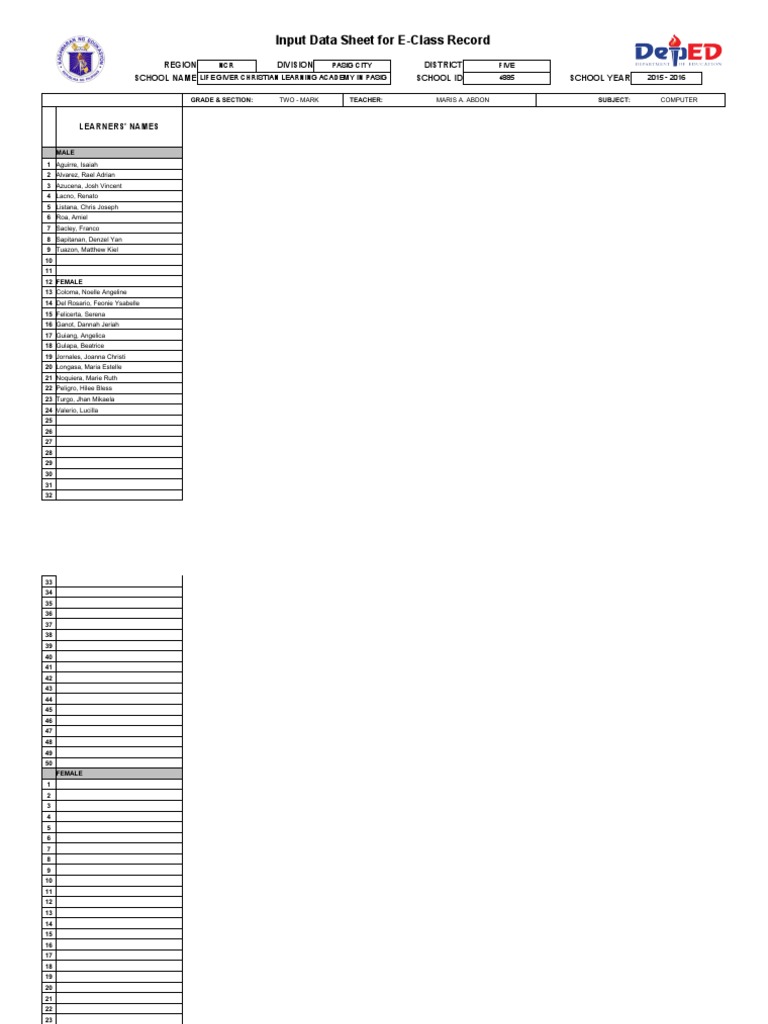 THE LIFE GIVER CHRISTIAN LEARNING ACADEMY IN PASIG INC. SCHOOL ID 4885 SCHOOL YEAR 2015 - 2016
