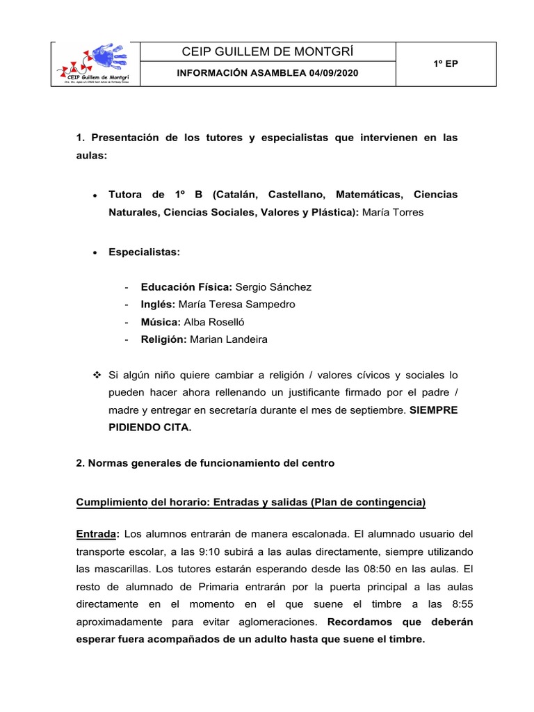 • Tutora de 1º B (Catalán, Castellano, Matemáticas, Ciencias