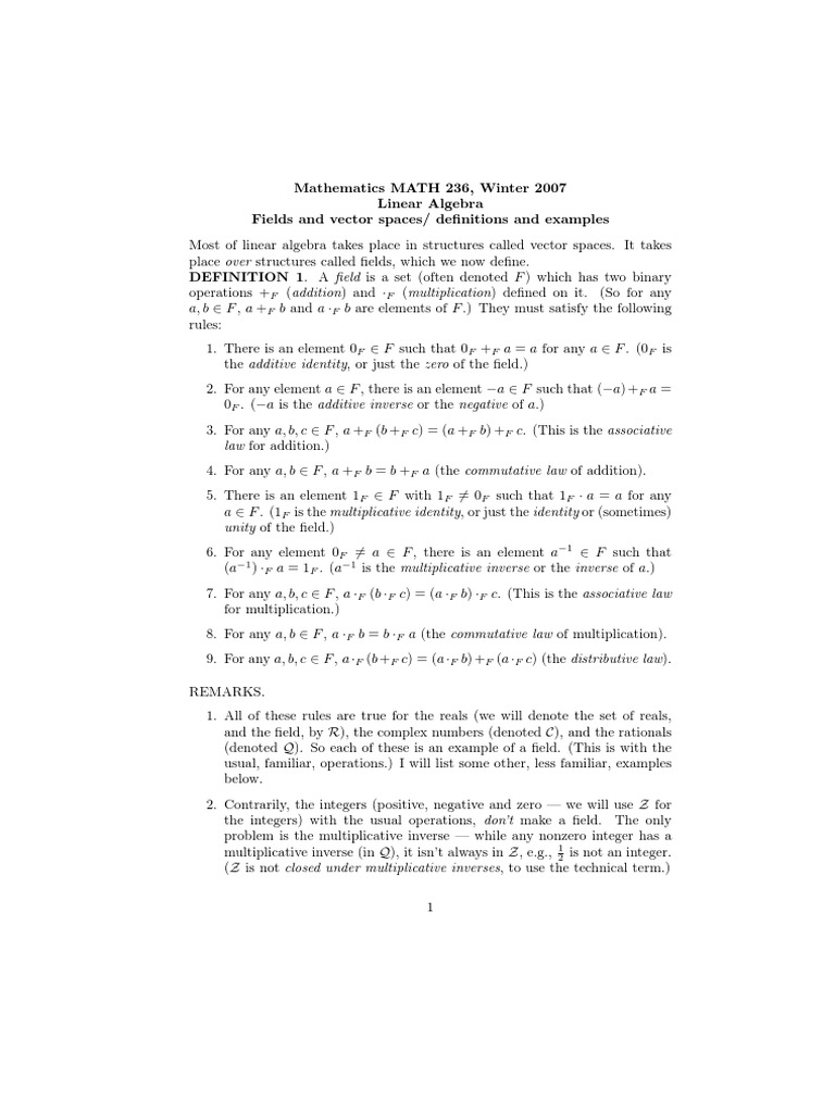 DEFINITION 1. A field is a set (often denoted F ) which has two binary