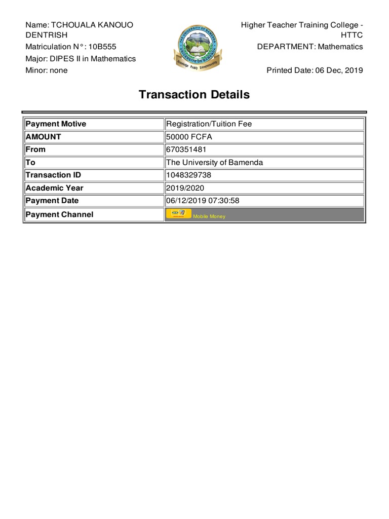 Name: TCHOUALA KANOUO Higher Teacher Training College -