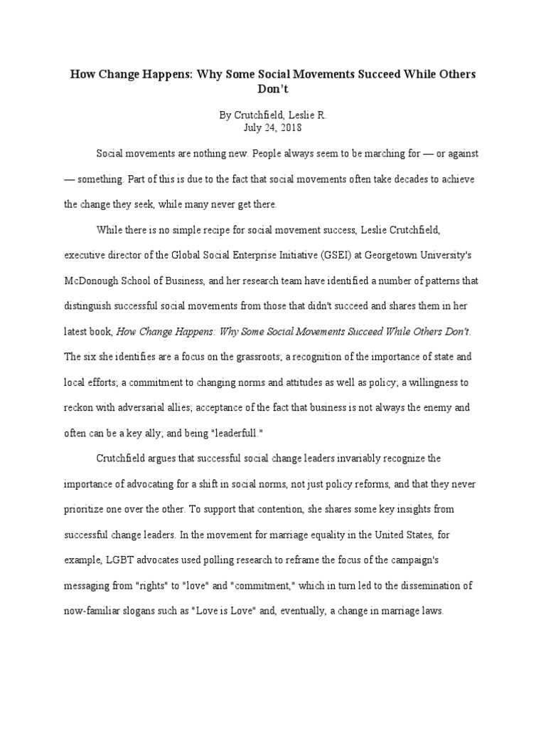 Crutchfield, Leslie R. “How Change Happens: Why Some Social Movements Succeed While