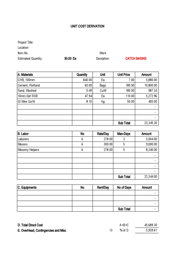 UNIT COST DERIVATION