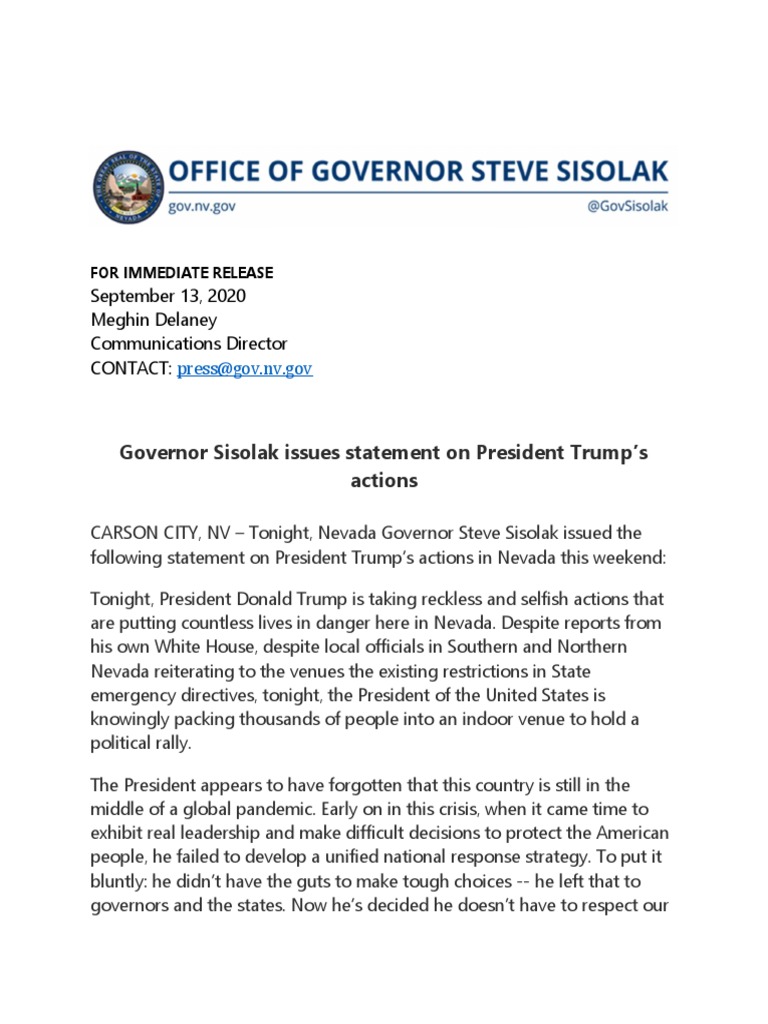 CARSON CITY, NV – Tonight, Nevada Governor Steve Sisolak issued the following statement on President Trump’s actions in Nevada this weekend: Tonight, President Donald Trump is taking reckless and selfish actions that are putting countless lives in danger here in Nevada. Despite reports from his own White House, despite local officials in Southern and Northern Nevada reiterating to the venues the existing restrictions in State emergency directives, tonight, the President of the United States is knowingly packing thousands of people into an indoor venue to hold a political rally. The President appears to have forgotten that this country is still in the middle of a global pandemic. Early on in this crisis, when it came time to exhibit real leadership and make difficult decisions to protect the American people, he failed to develop a unified national response strategy. To put it bluntly: he didn’t have the guts to make tough choices -- he left that to governors and the states. Now he’s decided he doesn’t have to respect our