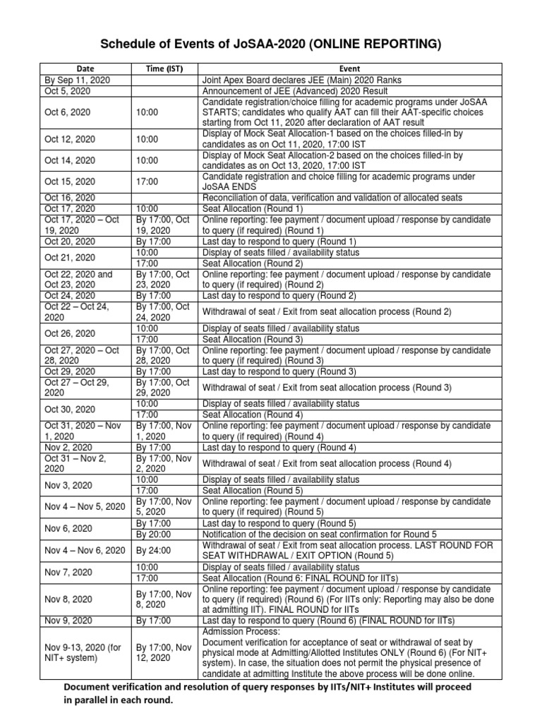 Schedule of Events of JoSAA-2020 (ONLINE REPORTING)