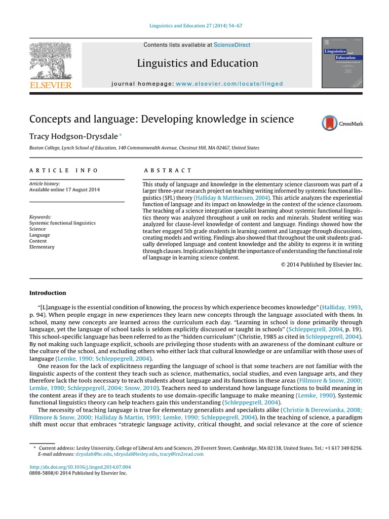 Article history: This study of language and knowledge in the elementary science classroom was part of a