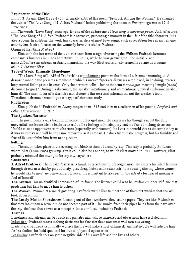 ......."The Love Song of J. Alfred Prufrock" is a modernistic poem in the form of a dramatic monologue. A