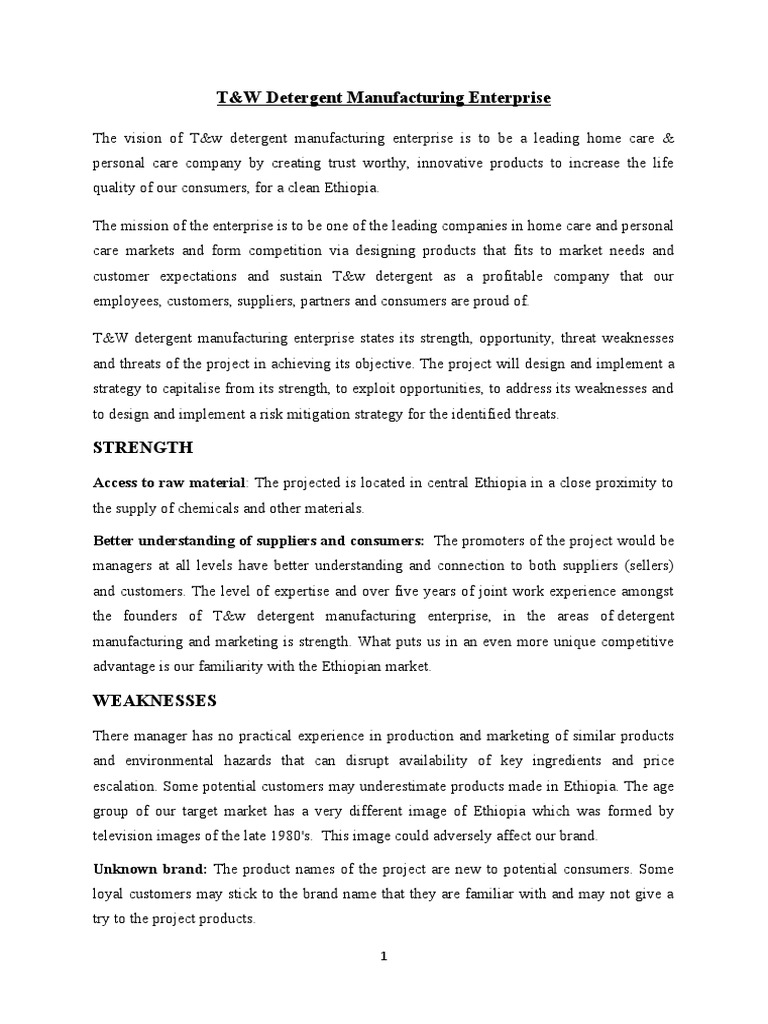 T&W detergent manufacturing enterprise states its strength, opportunity, threat weaknesses