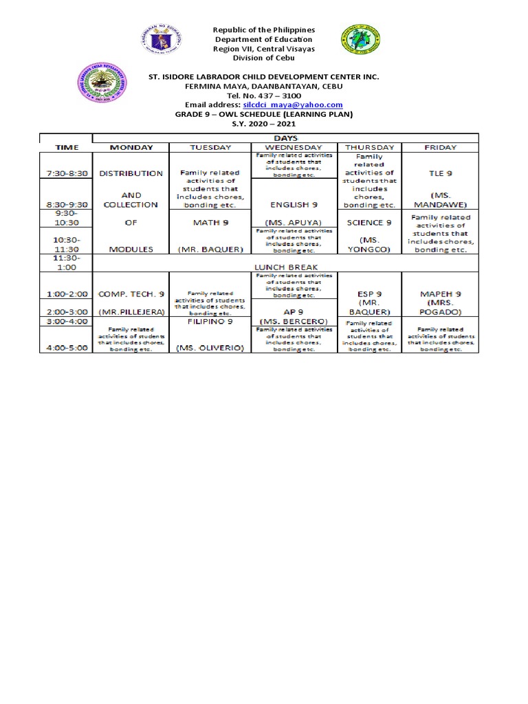 GRADE 9 – OWL SCHEDULE (LEARNING PLAN)