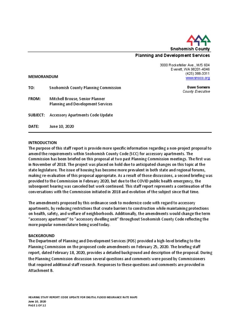 The purpose of this staff report is provide more specific information regarding a non-project proposal to amend the requirements within Snohomish County Code (SCC) for accessory apartments. The Commission has been briefed on this proposal at two past Planning Commission meetings. The first was in November of 2018. The project was placed on hold due to anticipated changes on this topic at the state legislature. The issue of housing has become more prevalent in both state and regional forums, making re-evaluation of this proposal appropriate. As a result of those discussions, a second briefing was provided to the Commission in February 2020, but due to the COVID public health emergency, the subsequent hearing was canceled but work continued. This staff report represents a continuation of the conversations with the Commission initiated in 2018 and evolution of the subject since that time. The amendments proposed by this ordinance seek to modernize code with regard to accessory apartments, by reducing restrictions that create barriers to construction while maintaining protections on health, safety, and welfare of neighborhoods. Additionally, the amendments would change the term “accessory apartment” to “accessory dwelling unit” throughout Snohomish County Code reflecting the more popular nomenclature being used today.