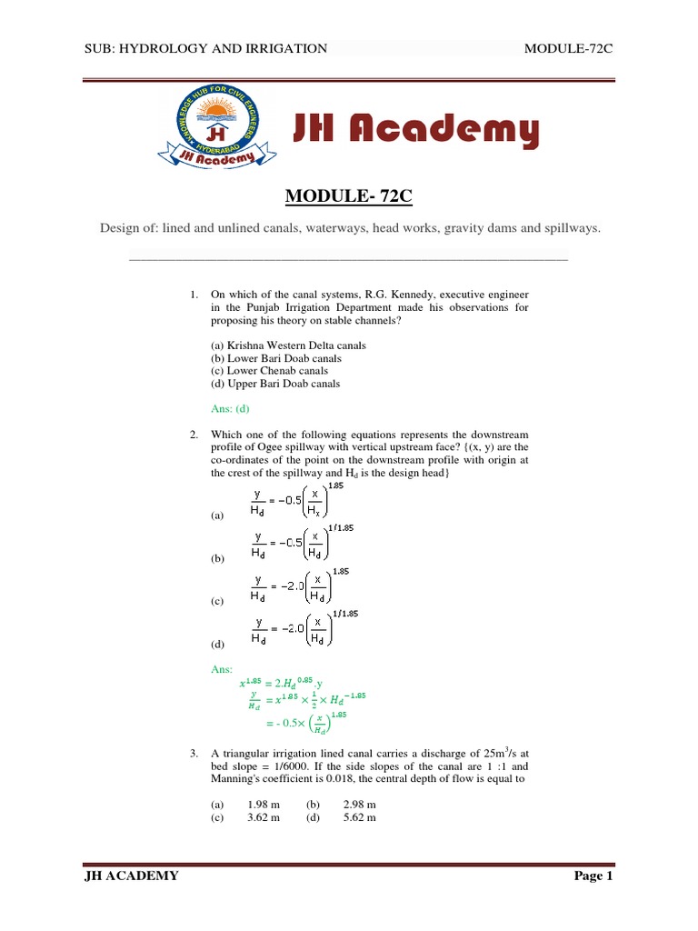 Design of: lined and unlined canals, waterways, head works, gravity dams and spillways.