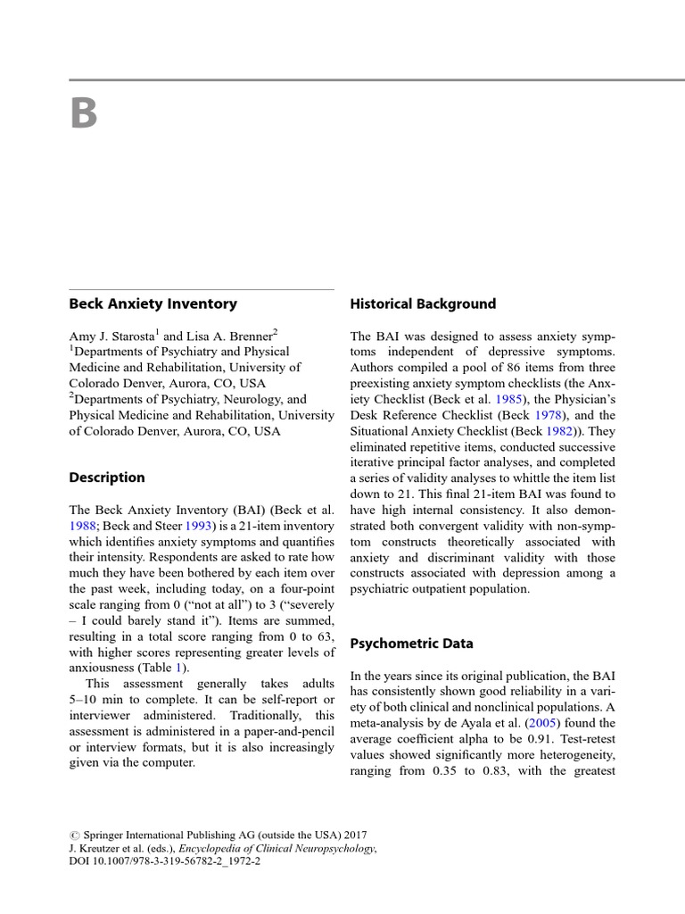 Amy J. Starosta1 and Lisa A. Brenner2 The BAI was designed to assess anxiety symp-