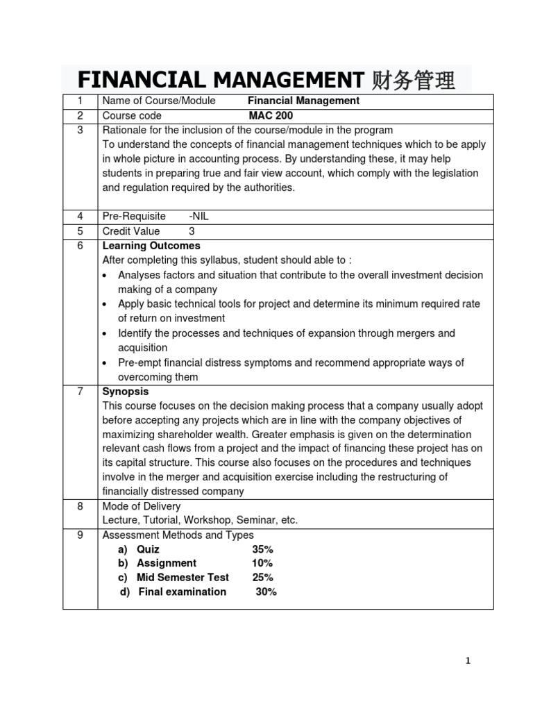 1 Name of Course/Module Financial Management