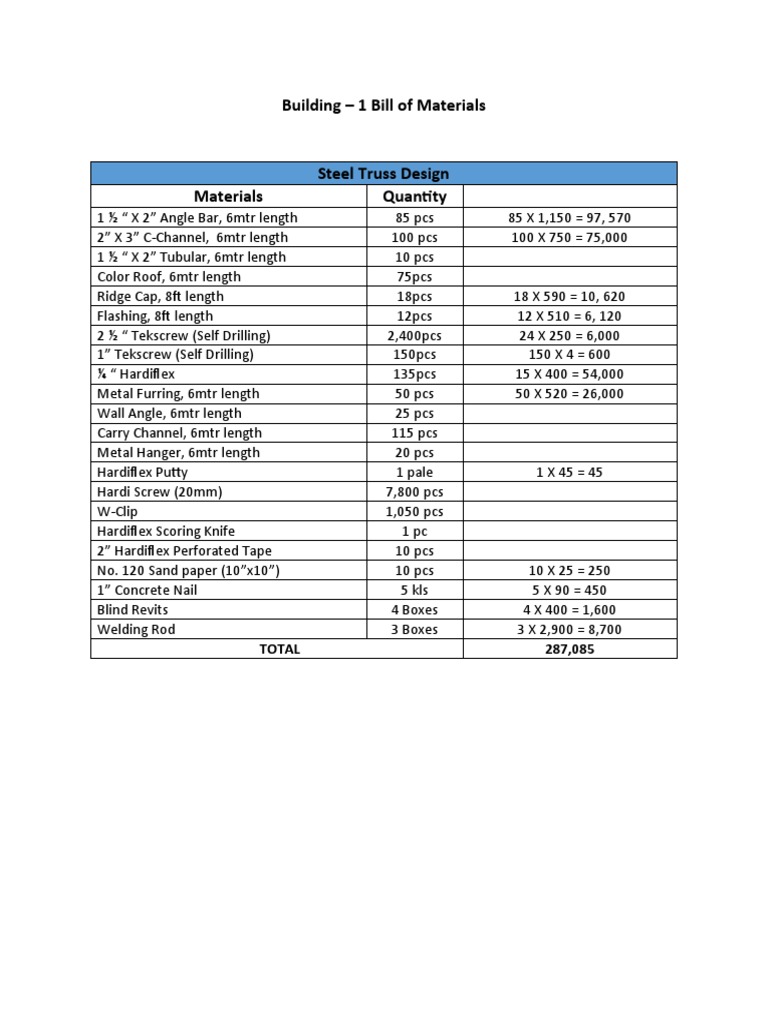 1 ½ “ X 2” Angle Bar, 6mtr length 85 pcs 85 X 1,150 = 97, 570