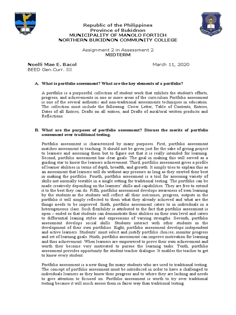 B. What are the purposes of portfolio assessment? Discuss the merits of portfolio